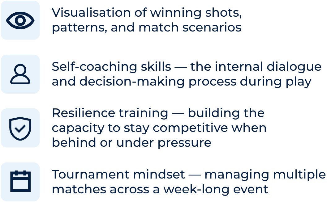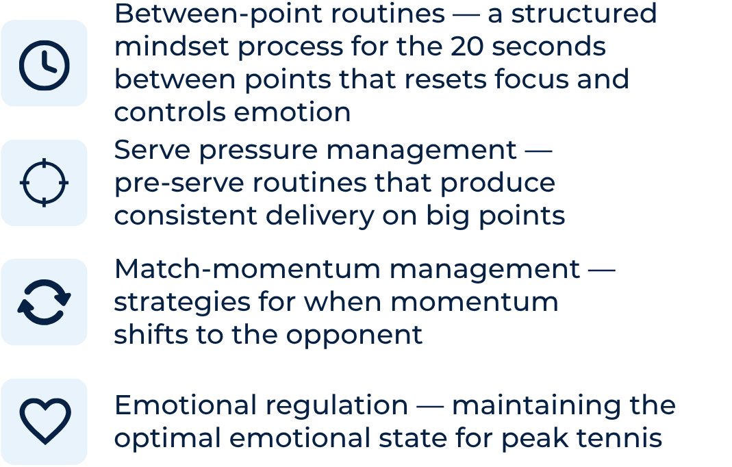 A: A between-point routine is a structured mental process that a tennis player uses in the 20 seconds between points to reset focus, regulate emotion, and prepare for the next point. Research consistently shows that top-ranked players have disciplined, consistent between-point routines — they use the time deliberately rather than dwelling on the last point. John Novak teaches players a personalised routine that includes a physical reset action, a focus-redirect sequence, and a preparation phase that locks in for the next point.